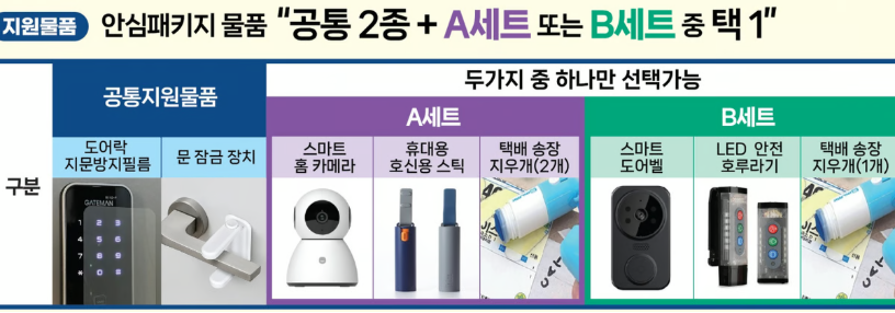 시·군에 따라 약간의 차이는 있지만 일반적으로 다음과 같은 안심 물품이 포함됩니다: