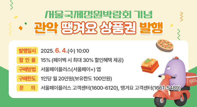 서울시 공공배달앱인 ‘땡겨요’ 앱을 설치한 후, 결제수단에 서울페이 상품권을 등록하세요. 이후 결제 시 10%는 다음 달 상품권으로 환급되고, 5%는 포인트로 적립되어 총 30%의 할인 혜택을 누릴 수 있습니다.