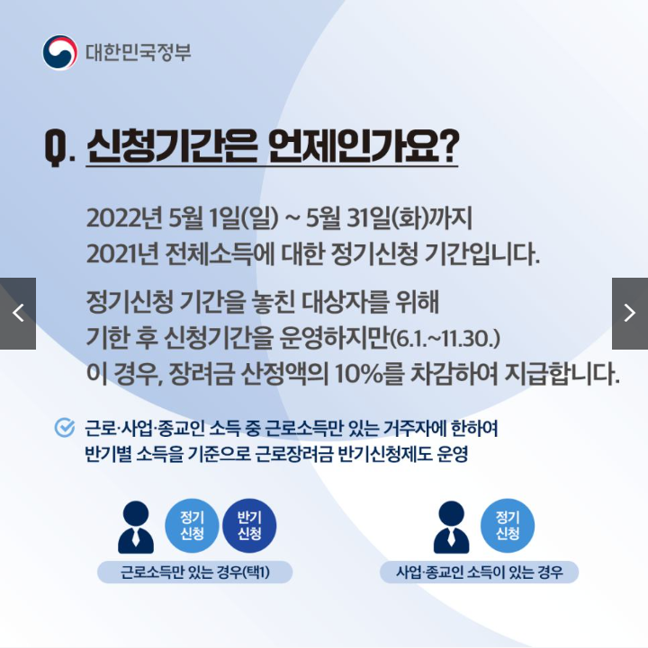 근로소득자의 경우 정기신청과 반기신청 중 선택할 수 있지만, 자신의 소득 형태와 자녀 유무에 따라 전략적으로 선택해야 합니다. 자녀장려금을 함께 받고 싶다면 무조건 정기신청을 선택하세요!
