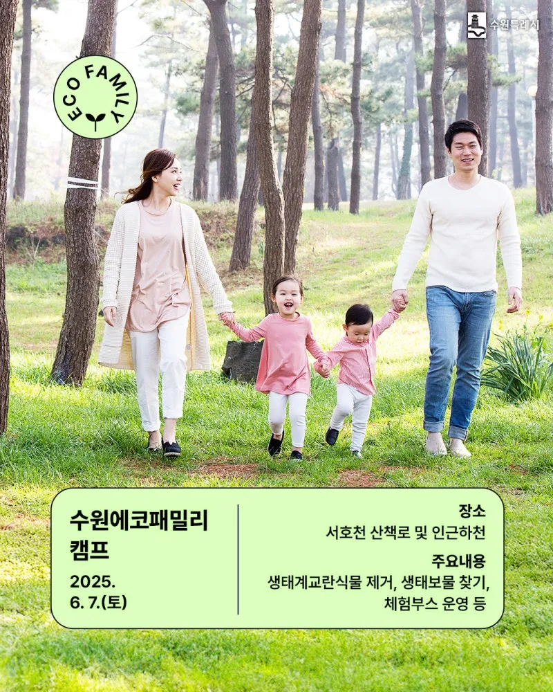 가족이 함께하는 생태 체험 프로그램으로, 서호천 생태계를 배경으로 교란식물 제거, 생태보물찾기, 체험 부스 등이 운영됩니다. 아이들과 함께 자연 속에서 놀며 환경을 체험하는 의미 있는 시간이 될 것입니다.