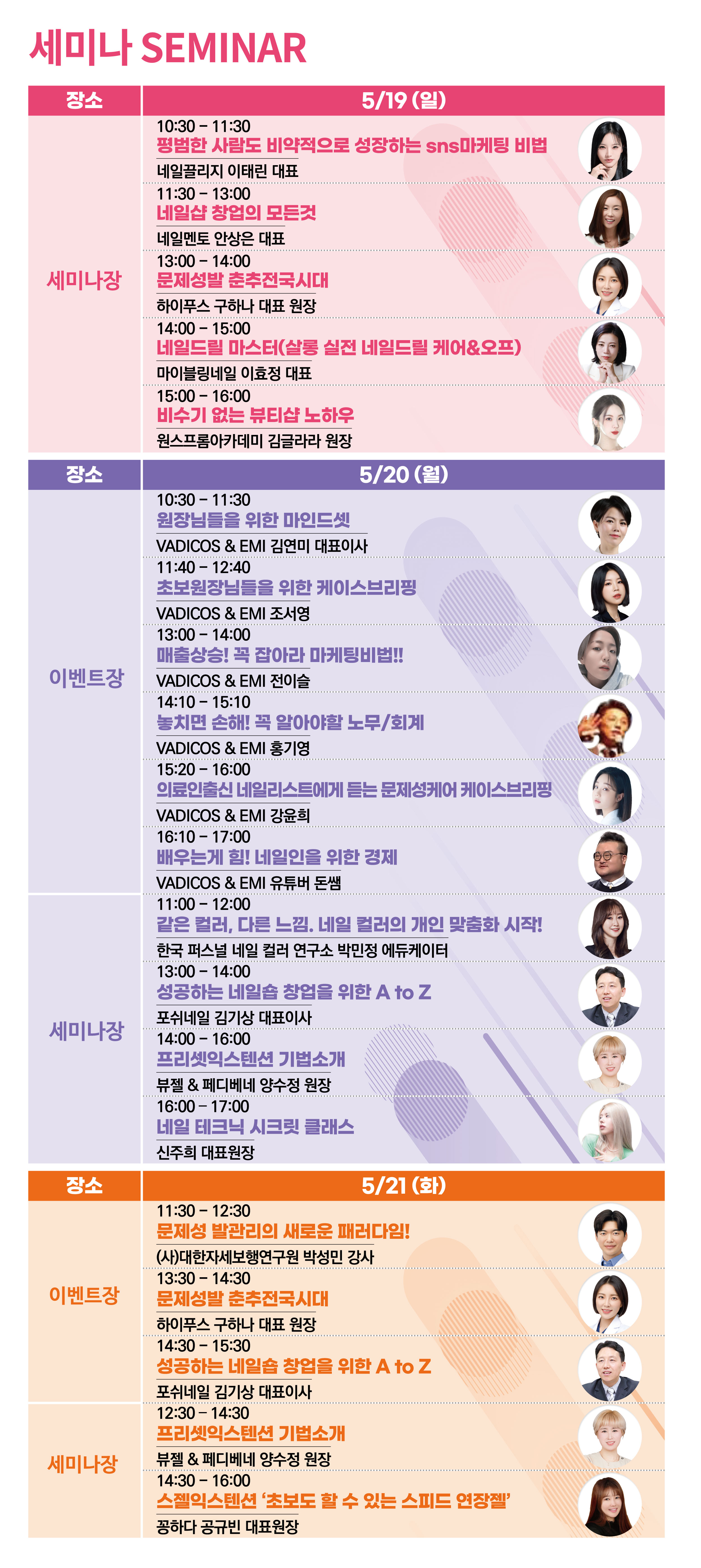 부대 행사로는 트렌드 세미나, 실시간 데모쇼, 인플루언서 뷰티 토크쇼 등이 함께 열립니다.